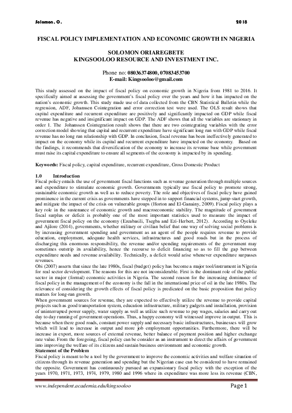 - Pdf Fiscal Policy And Economic Growth In Nigeria Emphasis On Various Components Of Public Expenditure , The Public Finance Act And Responsible Fiscal Management.