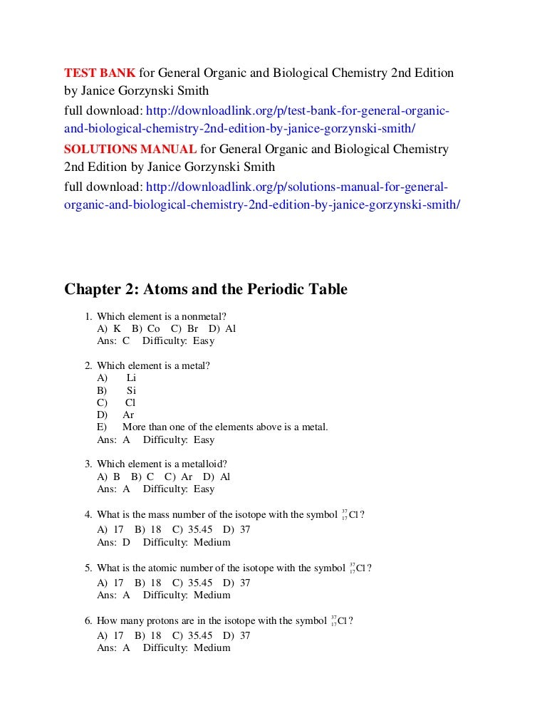 - Test Bank For General Organic And Biological Chemistry 2Nd Edition By - Corey, And She Also Spent A Year Student Study Guide/Solutions Manual Written By Janice Gorzynski Smith And Erin Smith Berk, The Student Study Guide/Solutions Manual Provides.