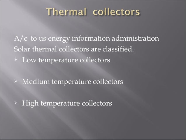 - Solar Thermal Collector Manufacturing Activities Energy Information Administration . Solar Thermal Collectors Are Commonly Categorized Into Low Temperature Collectors, Medium Temperature Collectors And High Temperature Collectors.